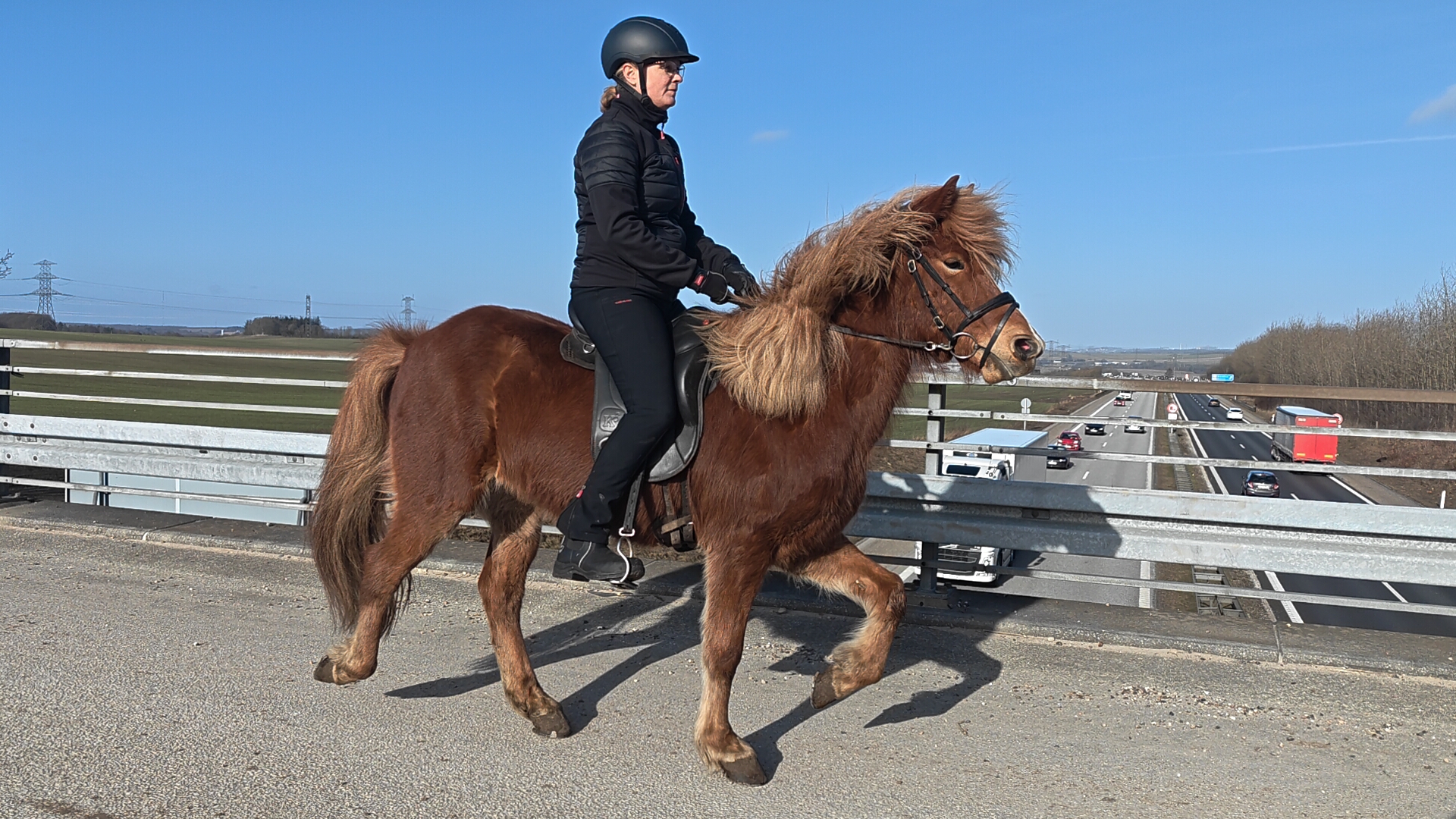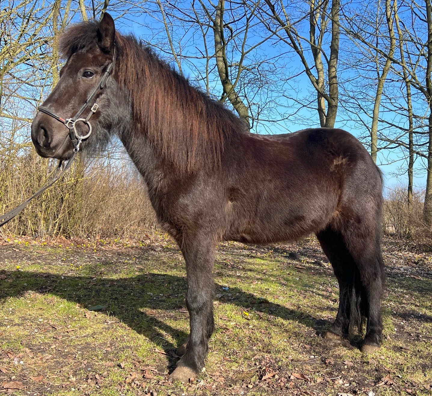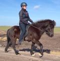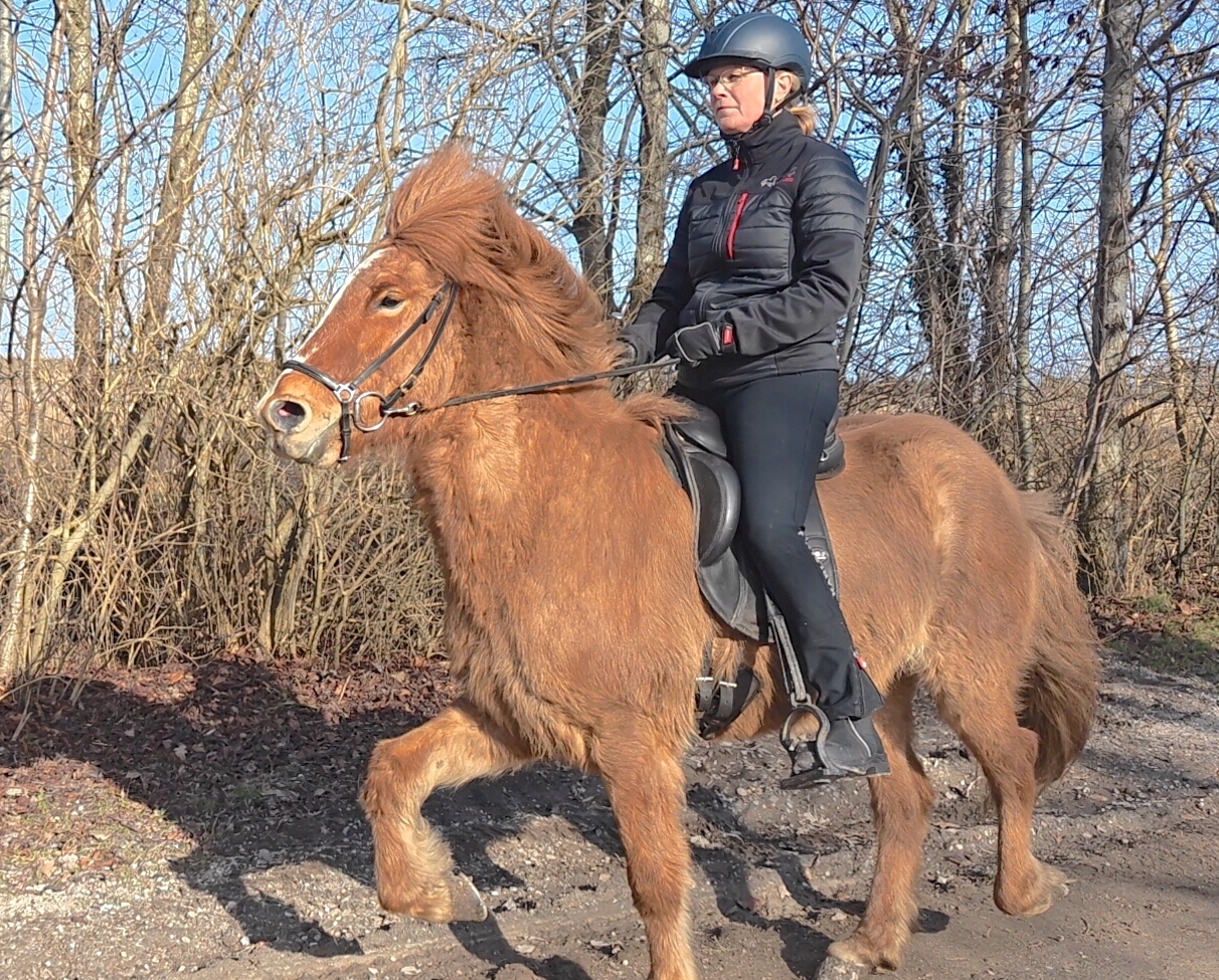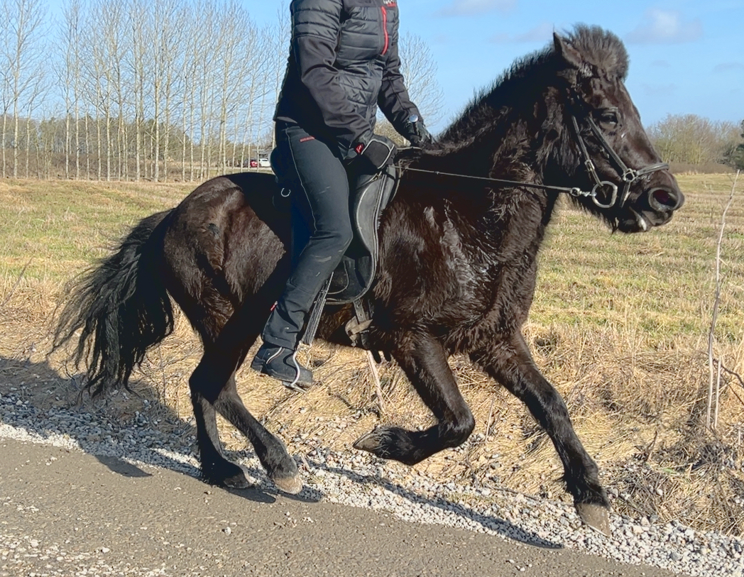 Pris: 75.000 kr. med moms. Lækker tølterAuðna fra Stutteri Geysir DK2020200211Auðna er en dejlig 6-årig hoppe på 141 cm, der kombinerer arbejdsglæde, ridelighed og mod i én skøn pakke. Hun er en fremadgående 4-gænger, som meget gerne vælger tølten som hun kan gå i hurtigt tempo. Hun er velredet og nem at stoppe. Hun elsker at arbejde – uanset om det er på banen eller på tur i naturen. Hun går naturligt fremad med dejlig energi, og er samtidig lydhør og blød i munden. Hun bliver ikke træt af at arbejde og giver altid en god ridetur, lige maget om hun er afsted alene eller i flok. Audna er velredet og god til dressurøvelser. Hun er modig og ikke bange for trafik. Derudover er hun nem at læsse i trailer. Hun har en smuk bygning og er meget velrejst. Hun blev tilredet for 2 år siden, så hun har opnået meget erfaring. Som ekstra bonus har hun fået et smukt sortbroget føl i 2024, og hun har vist sig som en god mor. Hun er efter Aik fra Mosegården og hans morfar er Þráinn frá Sigtúni som er kåret med 9 for tølt, skridt og trav og 8,51 for rid.